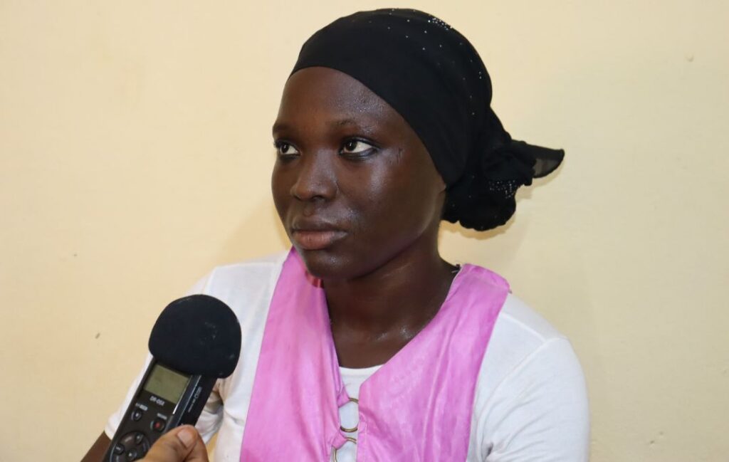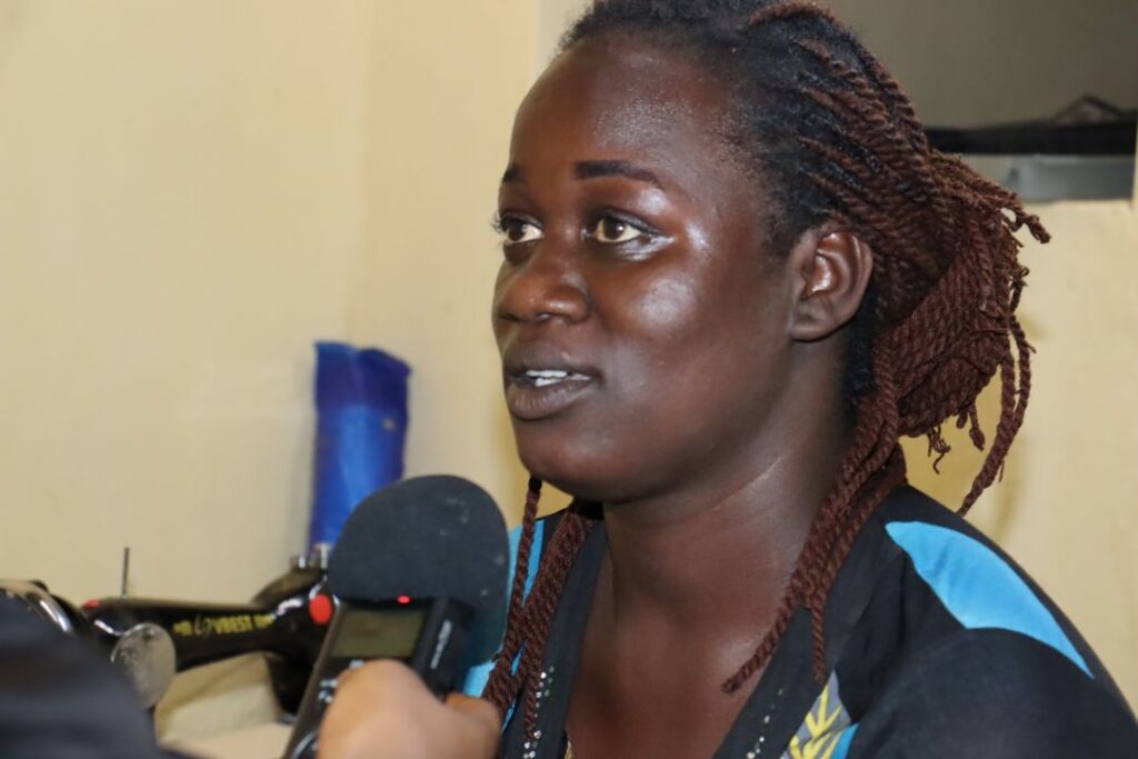 Depuis bientôt un an, Ladifatou se forme à la couture dans cet atelier de l’Union des femmes battantes. Elle sait déjà manier le fil et l’aiguille. Mais, c’est sa situation familiale difficile qui l’a conduite vers l’Union. « J’ai expliqué mon problème à la présidente. Elle m’a hébergée ici. Je ne suis pas déplacée interne, mais chez mes parents, ça ne va pas trop », souffle-t-elle. En venant ici, elle a pu payer ses études et soutenir en retour sa famille. Son passage lui a permis de se perfectionner en couture et en teinture. Désormais, elle appui aussi l’association dans la formation des nouvelles apprenantes.