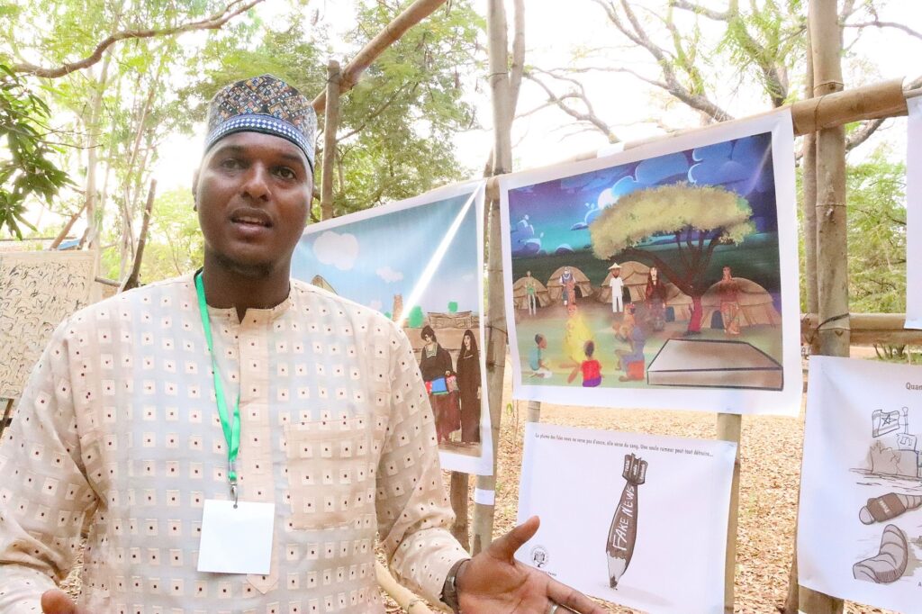Le visage lumineux, Hamza Ibrahim Ahmed, se tient devant ses œuvres et les explique aux visiteurs. Artiste nigérien engagé, il traite avec humour et acuité des sujets sociaux, politiques et environnementaux. Pour sa première expérience à Wekré et sa première venue au Burkina, le jeune caricaturiste et illustrateur dit être comblé.